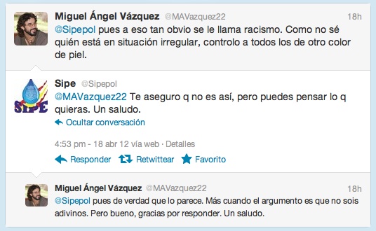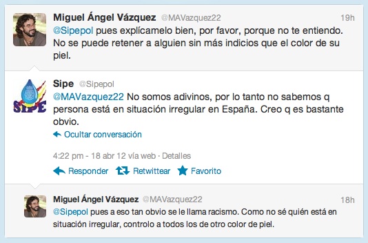 El otro día, notificando a las Brigadas vecinales de observación de Derechos Humanos una redada racista en mi barrio, una sana práctica que recomiendo a todo el mundo, me encontré con una reacción por tuiter que, ciertamente, no esperaba. El Sipe, un sindicato independiente de policía con una definición de sí mismo cuando menos curiosa, me escribía directamente para hacerme una pregunta cargada de ironía acerca de cuándo es lícito realizar detenciones. Aproveché la oportunidad para iniciar un debate que no tuvo desperdicio. Dentro de las grandes argumentaciones para justificar que se realicen controles de identidad en la calle a personas de otra raza, práctica que directamente les criminaliza dando por entendido que por el mero hecho de ser de otro color eres sospechoso de cometer una irregularidad, destacan perlas como «es ley de vida» o «no podemos ir contra la Naturaleza», aunque sin duda yo me quedo con la de «no somos adivinos». Supongo que esto del «no somos adivinos» debe de ser el nuevo «la policía no es tonta«. En fin, para que no os perdáis un detalle de esta conversación y para que podáis juzgar por vosotrxs mismxs, os la dejo aquí entera para que le echéis un vistazo. Mientras, yo me voy preparando para cuando también esto (argumentar) sea delito.