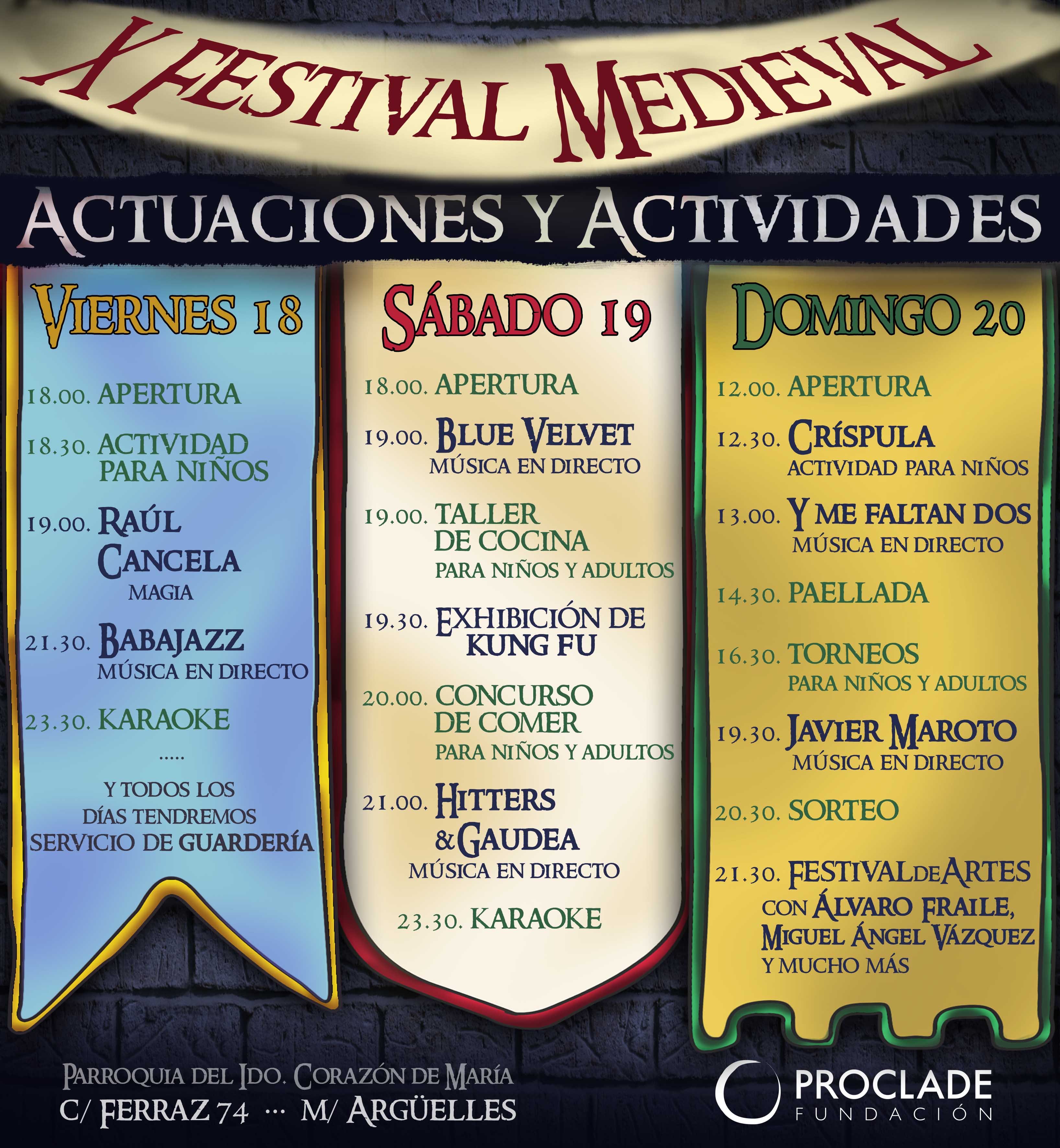 Parece mentira lo rápido que pasa el tiempo. Hace ya diez años del día en que a unos jóvenes de un centro juvenil madrileño les dio por montar un sencillo Festival Medieval (por entonces era «mercadillo») para recaudar fondos. Desde entonces y hasta hoy ha crecido hasta convertirse en un auténtico evento de calidad con música en directo, una taberna del medievo con todo tipo de platos y combinados, artesanía donada por la gente del barrio y actividades y torneos para todas las edades. Da idea del nivel el que este año actúen bandas como Blue Velvet, cover oficial de la Creedence Clearwater Revival, haya talleres de preparación de sushi o en la taberna se sirvan Kebabs medievales del chef Santiago González o gintónics de autor con una artesanal ginebra casera.