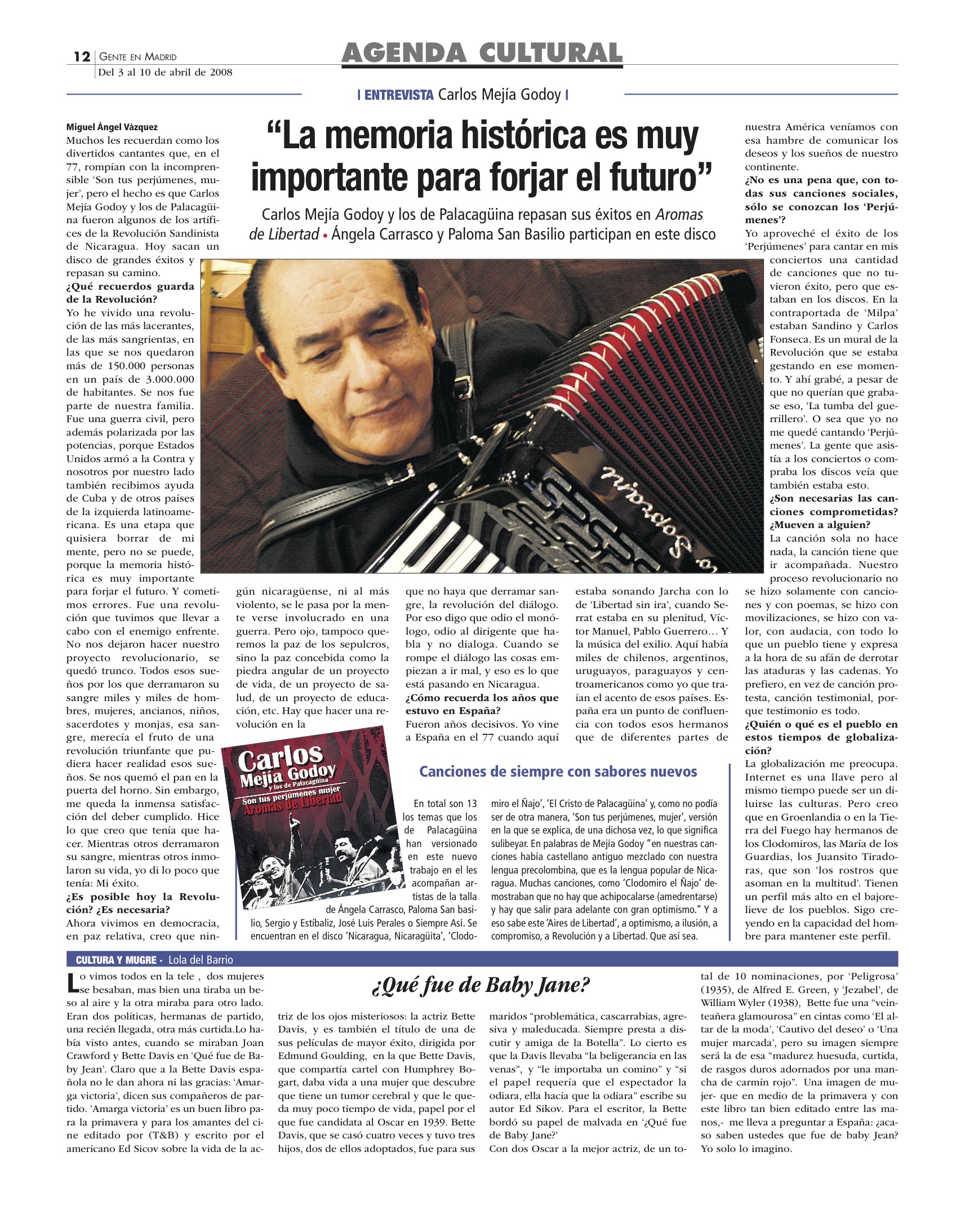 Entrevista al cantante Carlos Mejía Godoy publicada en el semanal Gente en Madrid.