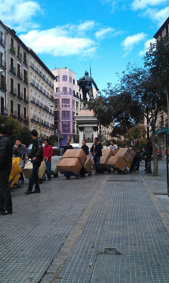 La cosa salió gracias a un concurso de fotografía organizado por la Asociación de Comerciantes Nuevo Rastro Madrid. Mi hermano, autor del flickr Harry CID que podéis ver en los enlaces, y mi primo Dani Hernández, ambos fotógrafos, me animaron para que les acompañase en su periplo fotero por el Rastro (el concurso era temático) y para que, ya que estaba ahí, me apuntase. El resultado es la imagen que encabeza esta entrada, una postal costumbrista del Madrid del siglo XXI. Si queréis verla impresa y expuesta e incluso votar por ella para que opte al premio del público no tenéis más que pasaros por la exposición que se estrena hoy mismo. El evento es recomendable, más que por esto, porque podáis ver las fotos con las que se presentaron mi hermano y mi primo entre otras.