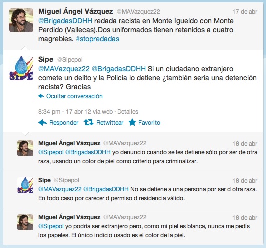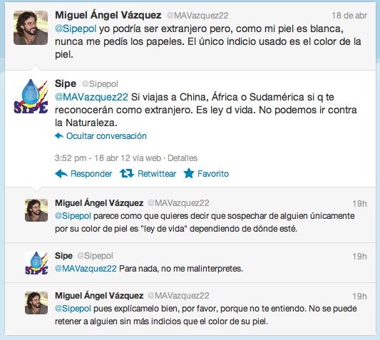 El otro día, notificando a las Brigadas vecinales de observación de Derechos Humanos una redada racista en mi barrio, una sana práctica que recomiendo a todo el mundo, me encontré con una reacción por tuiter que, ciertamente, no esperaba. El Sipe, un sindicato independiente de policía con una definición de sí mismo cuando menos curiosa, me escribía directamente para hacerme una pregunta cargada de ironía acerca de cuándo es lícito realizar detenciones. Aproveché la oportunidad para iniciar un debate que no tuvo desperdicio. Dentro de las grandes argumentaciones para justificar que se realicen controles de identidad en la calle a personas de otra raza, práctica que directamente les criminaliza dando por entendido que por el mero hecho de ser de otro color eres sospechoso de cometer una irregularidad, destacan perlas como «es ley de vida» o «no podemos ir contra la Naturaleza», aunque sin duda yo me quedo con la de «no somos adivinos». Supongo que esto del «no somos adivinos» debe de ser el nuevo «la policía no es tonta«. En fin, para que no os perdáis un detalle de esta conversación y para que podáis juzgar por vosotrxs mismxs, os la dejo aquí entera para que le echéis un vistazo. Mientras, yo me voy preparando para cuando también esto (argumentar) sea delito.
