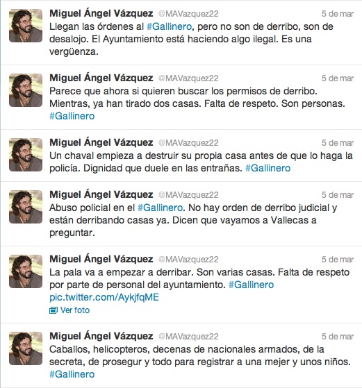 Les dejo a continuación, para complementar la información y en tres imágenes, algunos de los tuits que envié esa mañana de frustración y rabia en los derribos de El Gallinero. Van del último al primero.